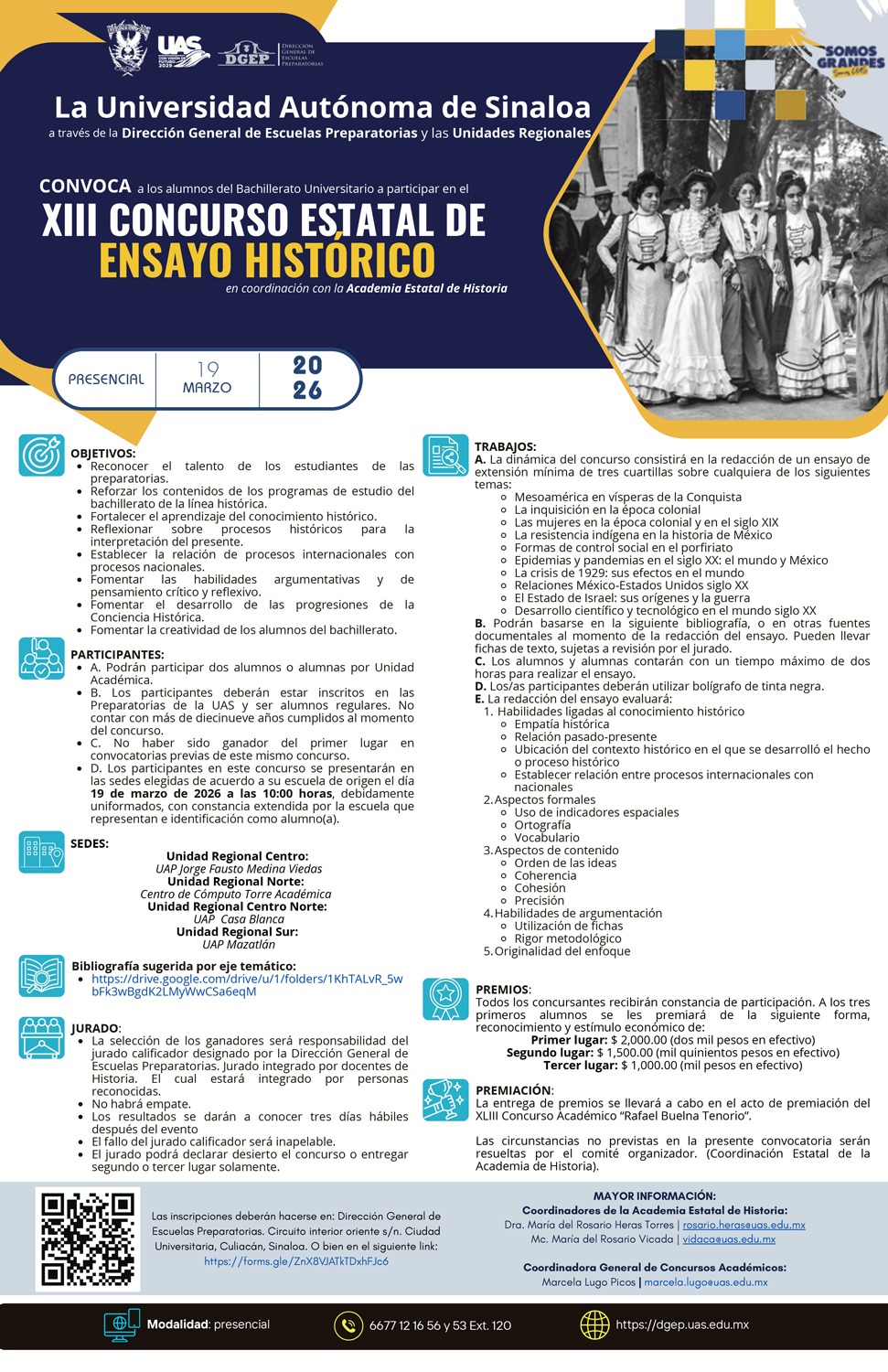 Siendo para los bachilleres el estudio de la historia fundamental no sólo como acumulación de datos, sino como una herramienta de formación ciudadana y pensamiento crítico, la Dirección General de Escuelas Preparatorias (DGEP) de la Universidad Autónoma de Sinaloa (UAS) está convocando, para el 19 de marzo del presente a año, a participar en el XIII Concurso Estatal de Ensayo Histórico, informó la doctora María del Rosario Heras Torres.