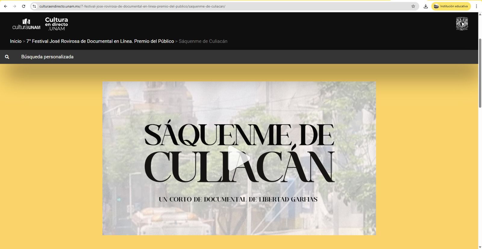 Libertad Garfias, alumna de la Licenciatura de Fotografía y Producción de Video de la casa de estudios sinaloense, mencionó que la categoría en la que se encuentra participando es Mejor Documental Estudiantil Mexicano, con un proyecto titulado “Sáquenme de Culiacán”.