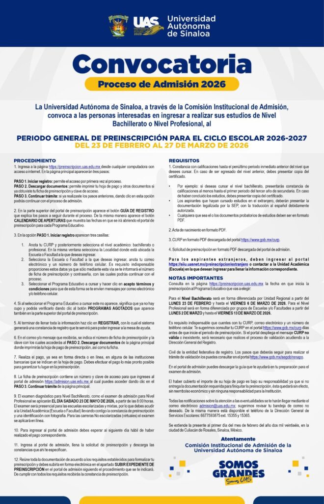 La Universidad Autónoma de Sinaloa (UAS) está lista para abrir sus plataformas el próximo 23 de febrero, con el fin de recibir las solicitudes de ingreso y entregar las fichas a los aspirantes a bachillerato. El proceso iniciará ese día exclusivamente para la Unidad Regional Centro (URC) y continuará una semana después, el 2 de marzo, para el nivel licenciatura.
