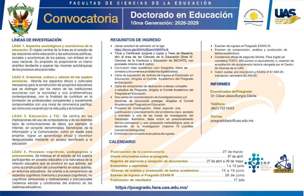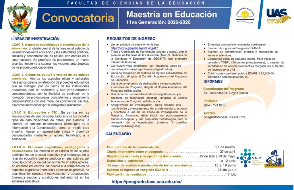 Posgrados con rigor académico, trayectoria consolidada y altos estándares de calidad: esta es la apuesta que impulsa la Facultad de Ciencias de la Educación (FACE) de la Universidad Autónoma de Sinaloa (UAS) al abrir su convocatoria para la Maestría (11.ª generación) y el Doctorado en Educación (10.ª generación), dirigidos a profesionales que buscan formarse en el campo de la investigación educativa.