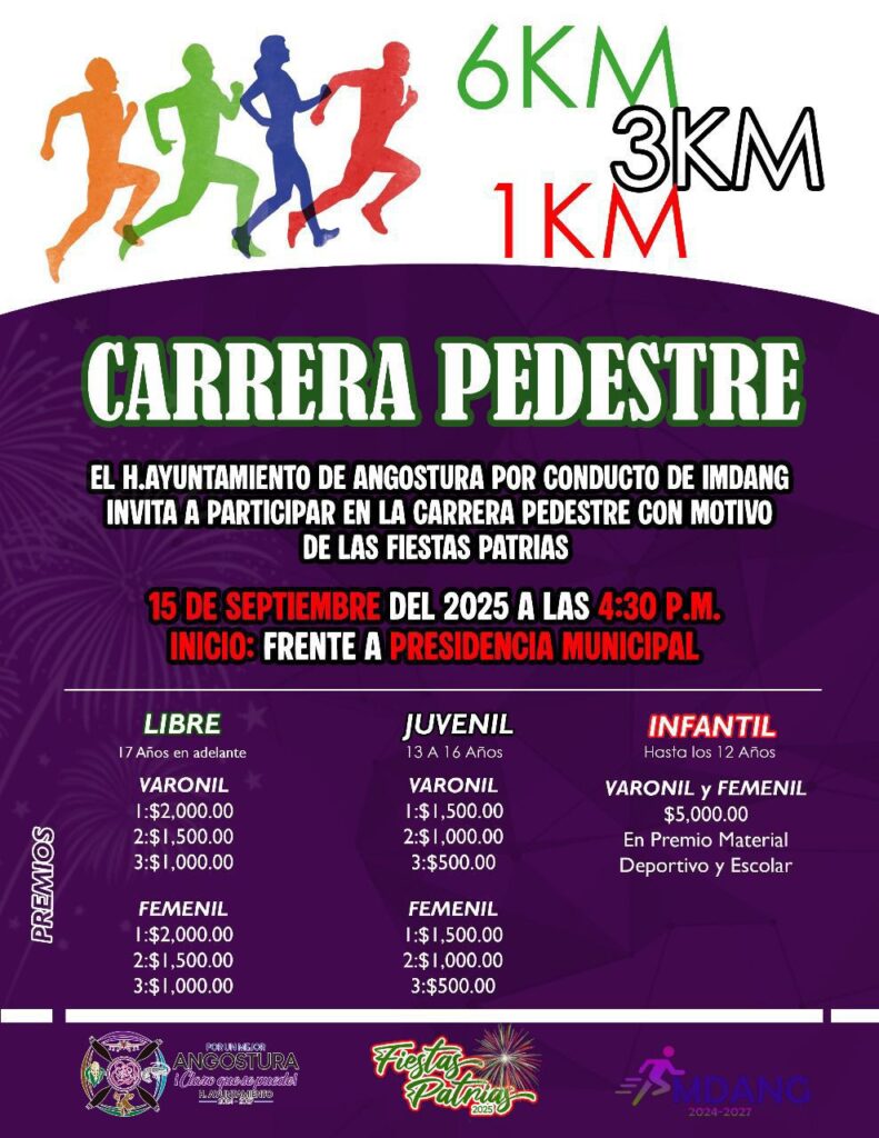 El H. Ayuntamiento de Angostura, a través de IMDANG, te invita a participar en la gran Carrera Pedestre con motivo de las Fiestas Patrias 🎆.