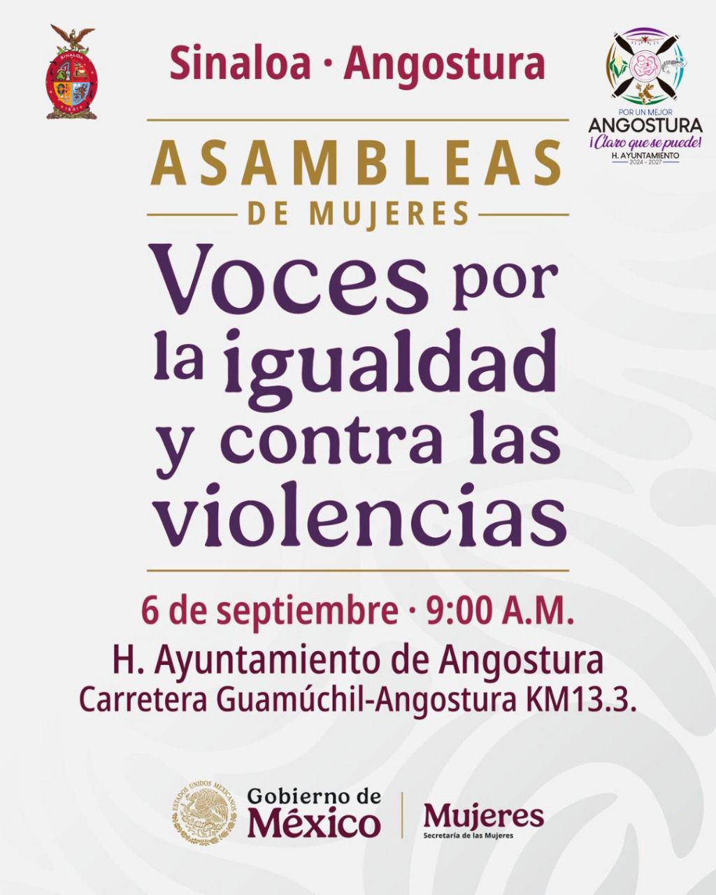 El Presidente Municipal, Alberto “El Capy” Rivera, a través del Instituto Municipal de las Mujeres (IMMUJERES), extiende una cordial invitación a todas las mujeres de Angostura para participar en la Asamblea de Mujeres titulada “Voces por la igualdad y contra la violencia”.
