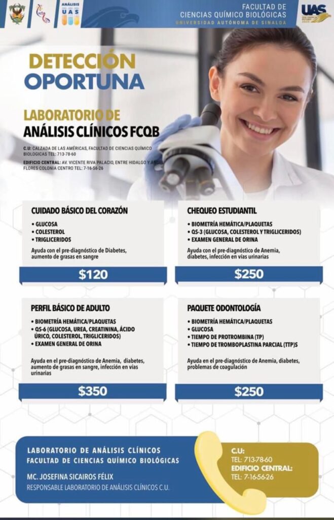 Los laboratorios de análisis clínicos son fundamentales para la prevención en salud, ya que permiten la detección temprana de enfermedades asintomáticas, el monitoreo de factores de riesgo (como glucosa o perfil lipídico) y la evaluación del estado general. Esto facilita intervenciones oportunas que aumentan la esperanza de vida. Por ello, la Facultad de Ciencias Químico Biológicas (FCQB) de la Universidad Autónoma de Sinaloa (UAS) invita a la población en general a aprovechar los servicios de su laboratorio, los cuales destacan por su alta calidad y precios accesibles, según señaló Josefina Sicarios Félix.