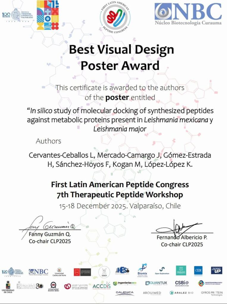 La docente e investigadora de la Facultad de Ciencias Químico Biológicas (FCQB) de la UAS señaló que, recientemente en Chile, en el 1er Congreso de péptidos terapéuticos en Latinoamérica y el 7mo Workshop de péptidos, presentó mediante unos carteles los avances de estas investigaciones, las cuales fueron muy bien aceptadas y uno de los trabajos recibió la distinción de primer lugar como mejor diseño virtual de carteles.