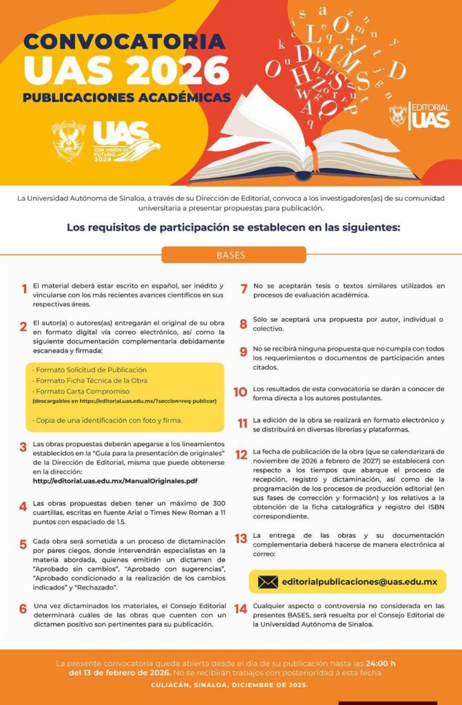 Detalló que los trabajos deberán ser inéditos, con una extensión máxima de 300 cuartillas, y cumplir con las pautas de estilo y formato señaladas por la Dirección de Editorial. Las propuestas deben acompañarse de la documentación requerida y enviarse de manera electrónica al correo editorialpublicaciones@uas.edu.mx antes de las 24:00 horas del 13 de febrero de 2026.