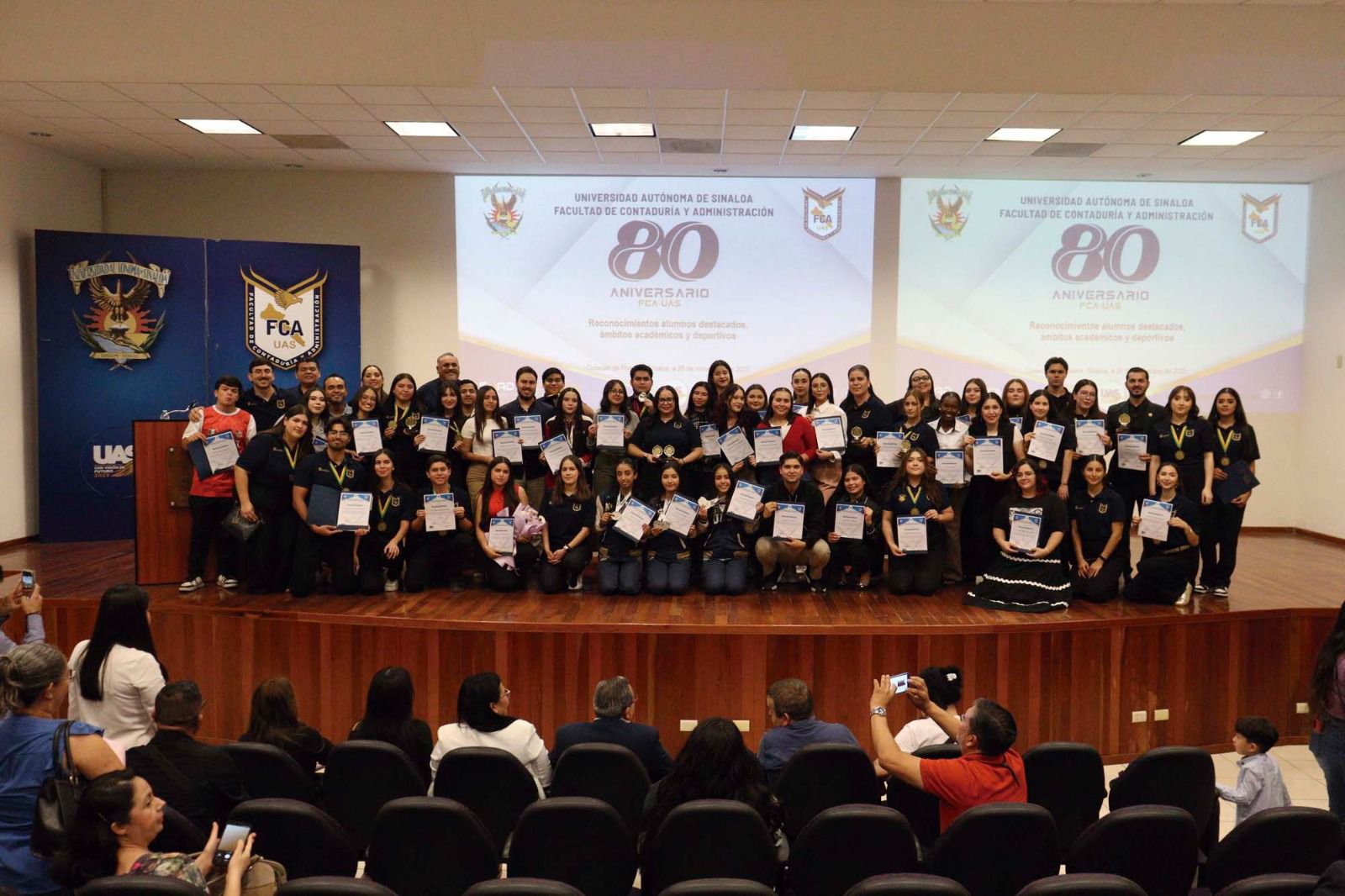 Por su desempeño y dedicación en el ámbito académico, deportivo y social, la Facultad de Contaduría y Administración (FCA) de la Universidad Autónoma de Sinaloa (UAS) entregó más de 50 reconocimientos a alumnas y alumnos destacados, en el marco de los festejos por el 80 aniversario del plantel.