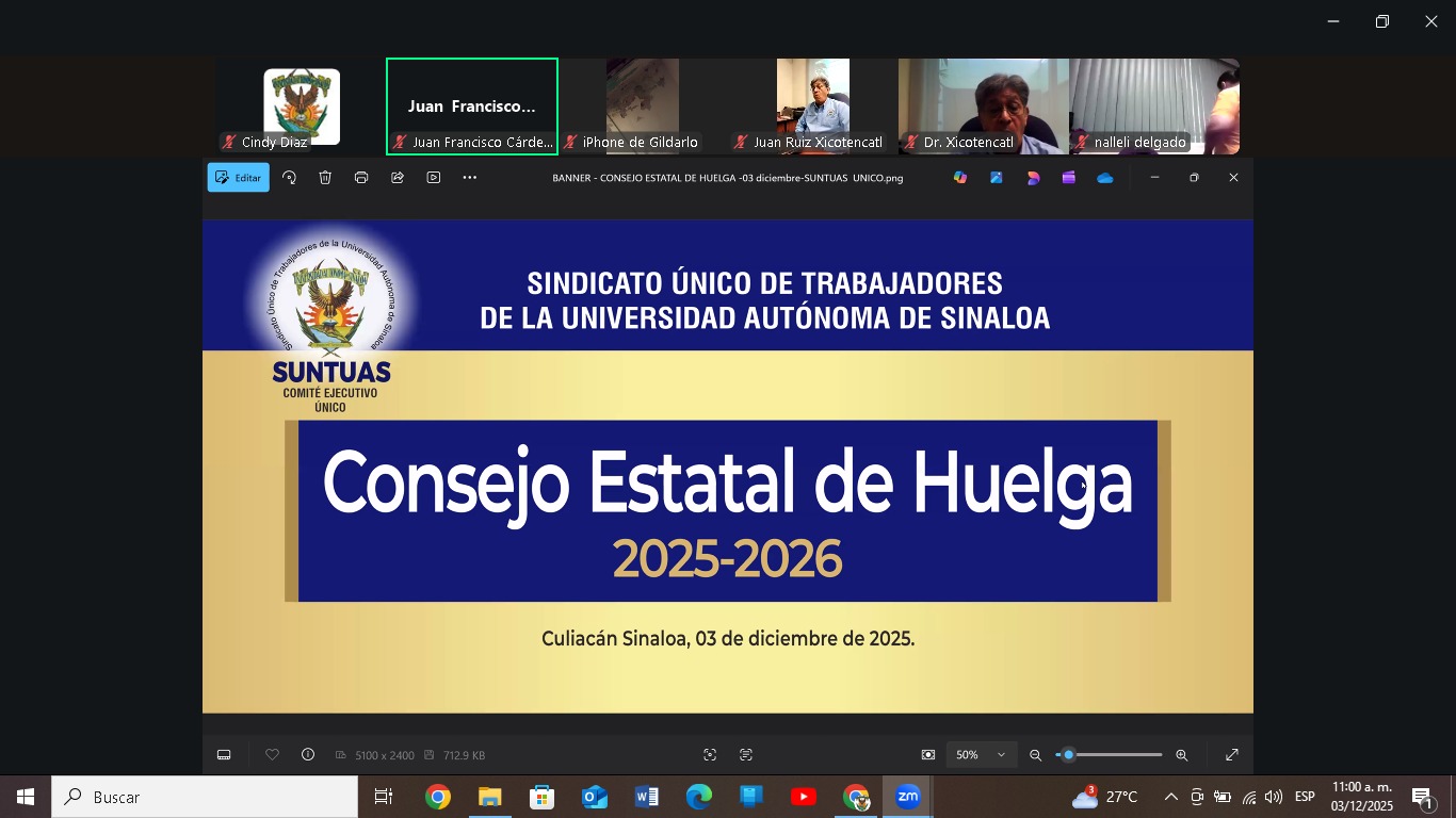 Por medio de la plataforma Zoom, casi trescientos cegedistas con el secretario general del SUNTUAS, el maestro Samuel Jesús Castro Camacho y el secretario de organización, el licenciado Isfa Bernabé Leal Salazar para conocer los resultados de la Mesa Negociadora Central, así como la logística y operatividad del referéndum dentro del marco del Emplazamiento a Huelga 2025-2026.