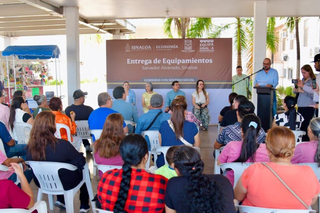 Guamúchil, Sinaloa, a 24 de octubre de 2025.- Gracias a las gestiones realizadas por la presidenta municipal de Salvador Alvarado, Lupita López González, ante el Gobierno del Estado de Sinaloa, que encabeza el gobernador Rubén Rocha Moya, se llevó a cabo la segunda entrega del programa impulsado por la Secretaría de Economía Equipa Sinaloa, mediante el cual se otorgaron 120 equipos a 43 emprendedores y sus familias, fortaleciendo la economía local y promoviendo el autoempleo.