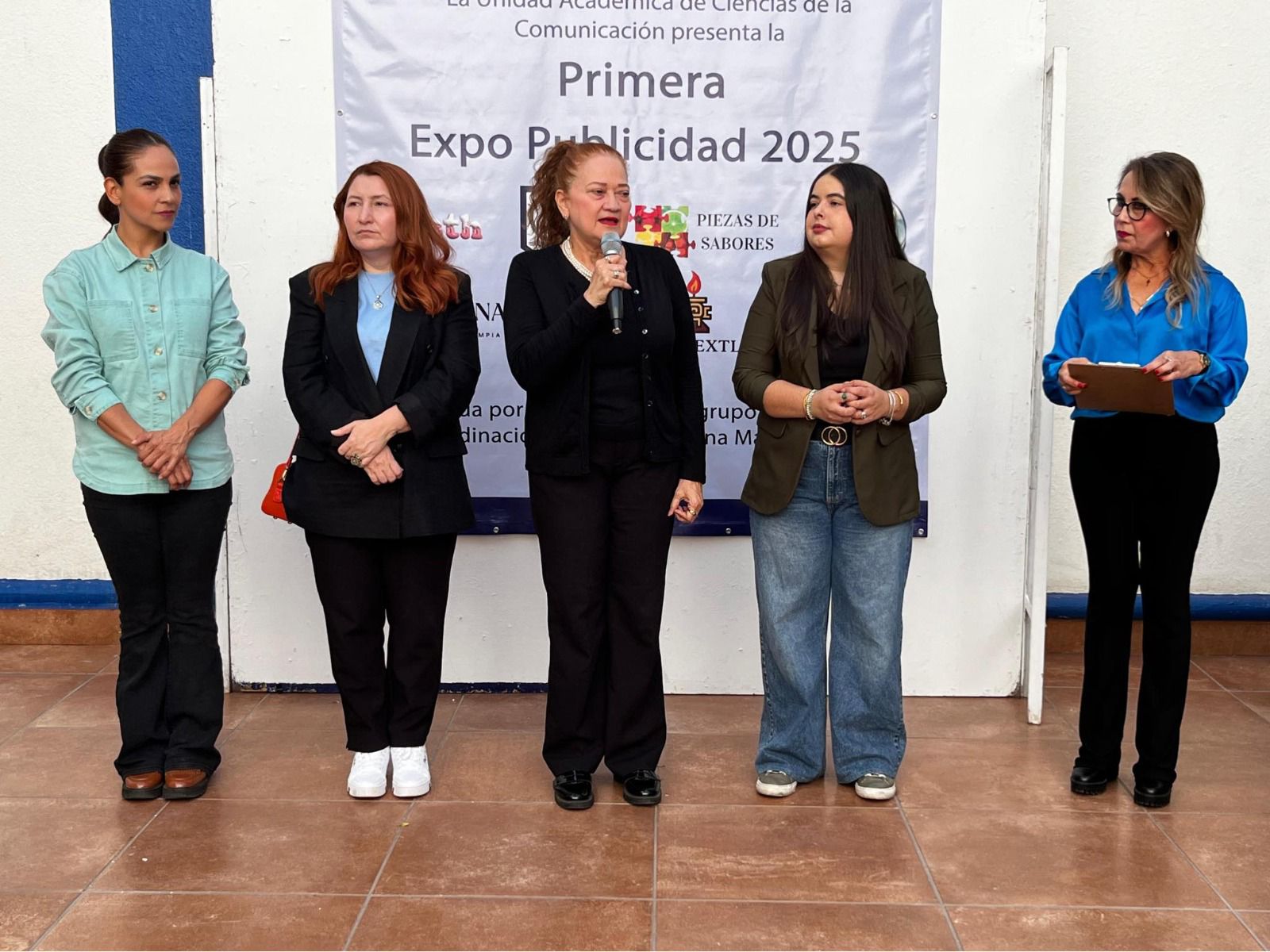Martha Patricia Castro López, directora de la Unidad Académica de Ciencias de la Comunicación, acompañada de su equipo de colaboración, previo a dar un recorrido por los stands para escuchar la exposición de los participantes, en su mensaje de bienvenida para poner en marcha la exposición, reconoció la calidad de los trabajos finales.