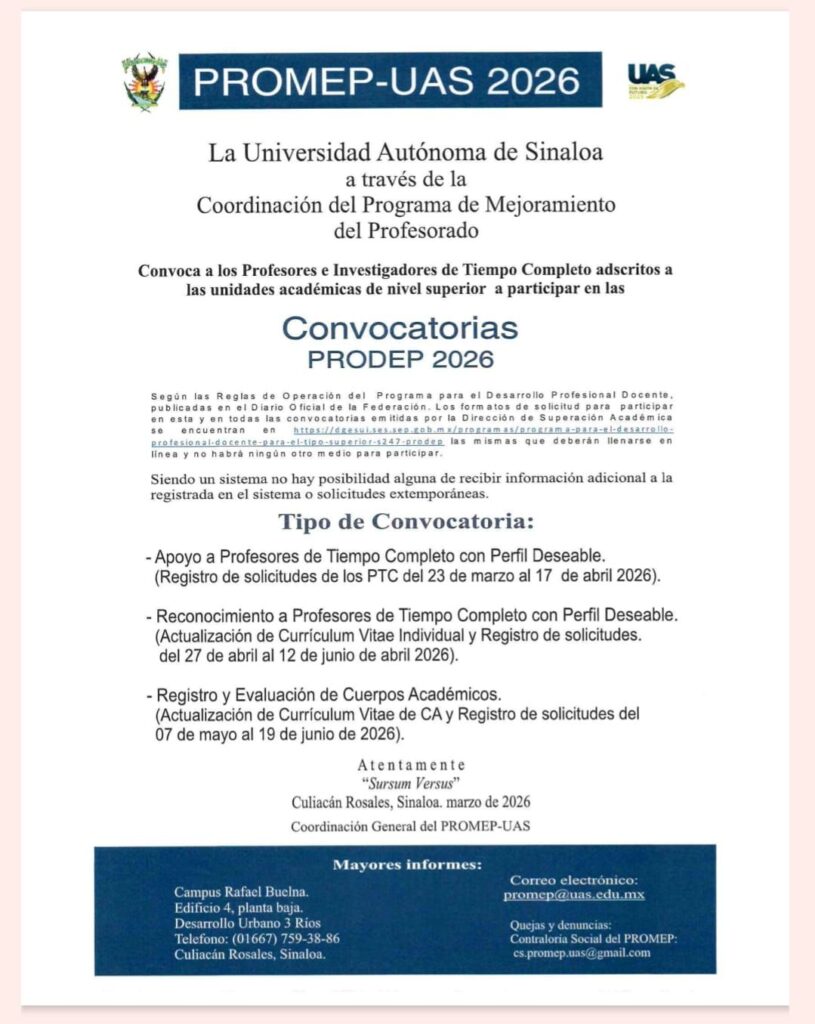 La Universidad Autónoma de Sinaloa (UAS), a través de la Coordinación del Programa de Mejoramiento del Profesorado, convoca a profesores e investigadores de tiempo completo (PTC) adscritos a las unidades académicas del nivel superior a participar en las “Convocatorias PRODEP 2026”.