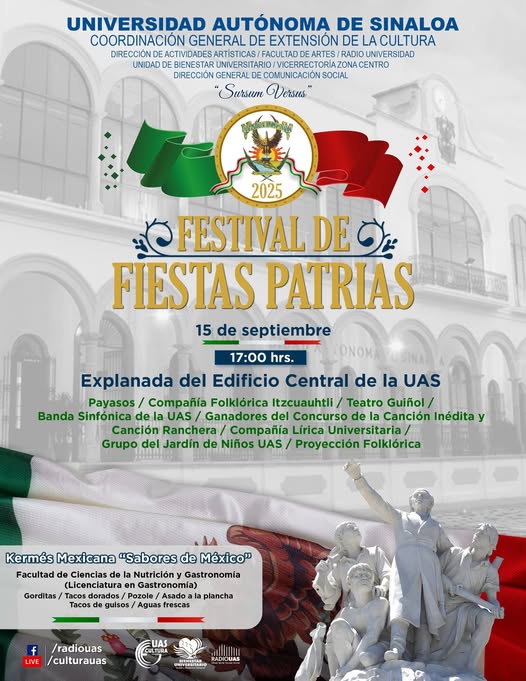 La Universidad Autónoma de Sinaloa (UAS) se alista para conmemorar el 215 aniversario del inicio de la Independencia de México, con una celebración llena de música, baile, color y sabor que ha denominado Festival de Fiestas Patrias, este próximo 15 de septiembre, en punto de las 5:00 de la tarde, en la explanada del Edificio Central.