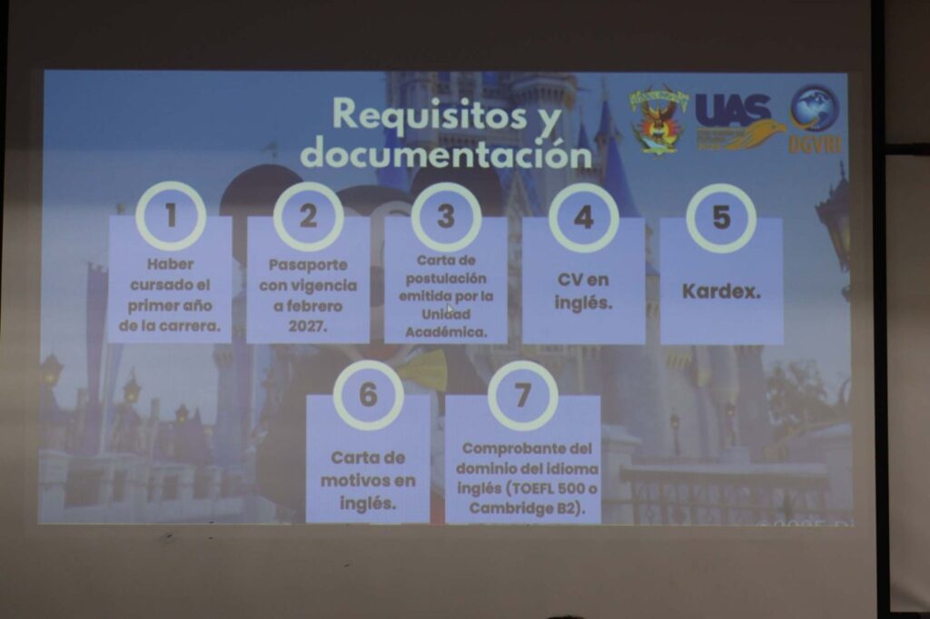Lara detalló que algunos de los requisitos para ingresar son: dominio del idioma inglés, ser mayor de 18 años, haber cursado el primer año de la carrera, estar inscritos en la Universidad Autónoma de Sinaloa, así como contar con pasaporte con vigencia a febrero 2027.