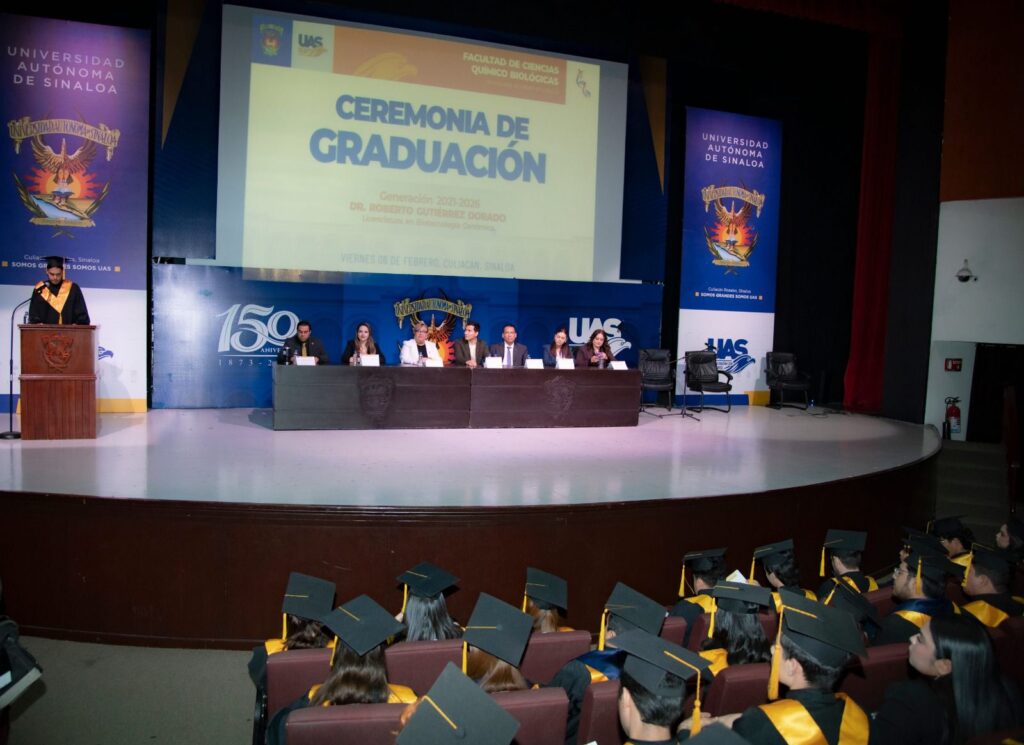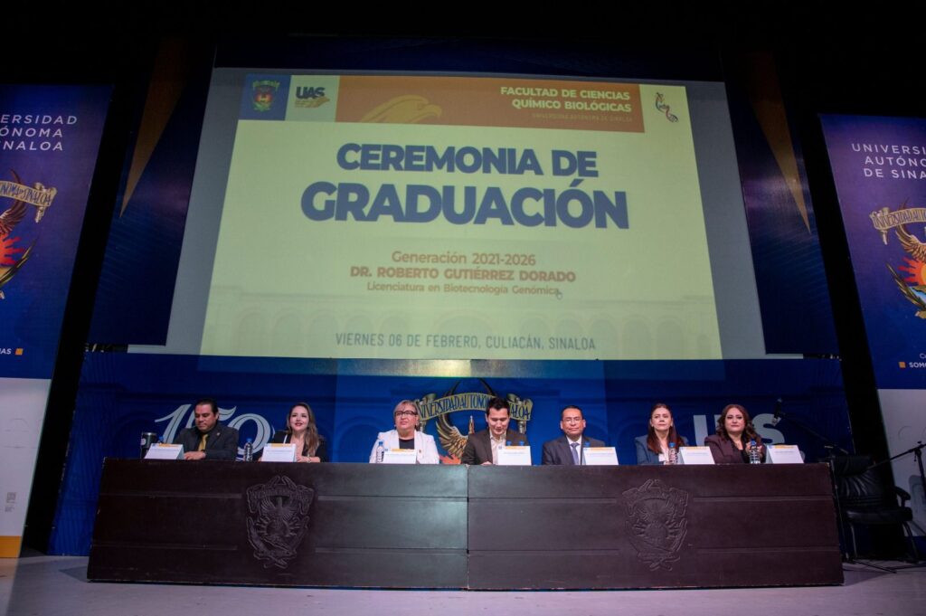 Teniendo como escenario la Torre Académica Culiacán, la Facultad de Ciencias Químico Biológicas (FCQB) de la Universidad Autónoma de Sinaloa (UAS) celebró con orgullo la ceremonia de graduación de la generación 2021-2026 de la Licenciatura en Biotecnología Genómica, la cual llevó por nombre “Doctor Roberto Gutiérrez Dorado”.