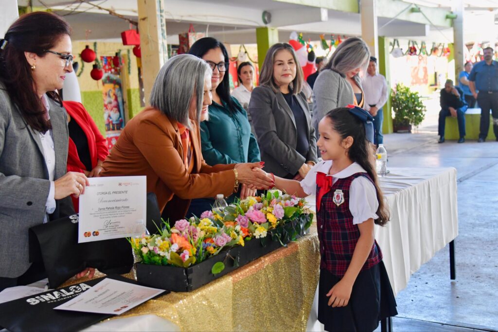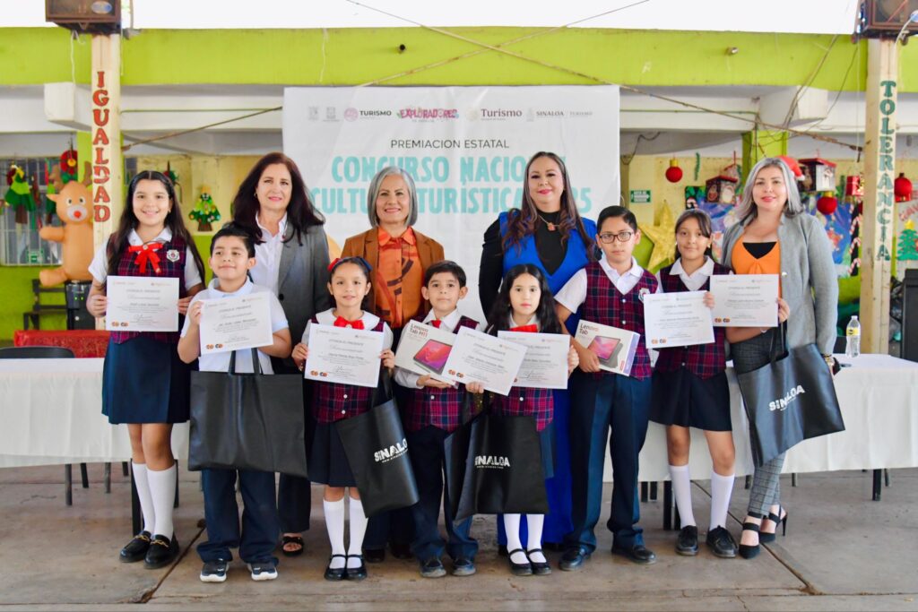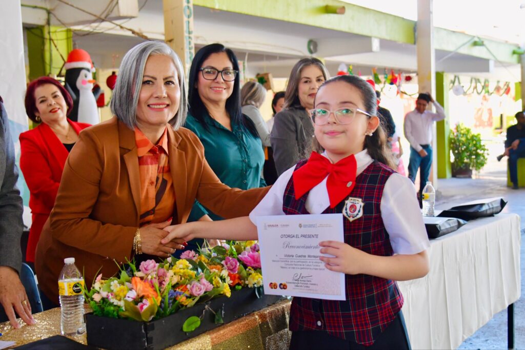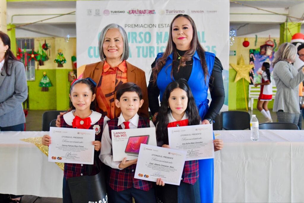 Guamúchil, Sinaloa; 10 de diciembre de 2025.- La presidenta municipal de Salvador Alvarado, Lupita López González, encabezó la ceremonia de premiación a las niñas y niños ganadores del Concurso Nacional de Cultura Turística 2025, en un bonito evento realizado en la primaria Samuel M. Gil, plantel del que surgieron varios de los trabajos reconocidos este año.