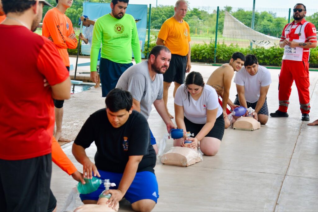 Guamúchil, Sinaloa; a 3 de septiembre del 2025.- Por indicaciones de la presidenta municipal Lupita López González, y con el objetivo de reforzar las medidas de seguridad y prevenir accidentes, Protección Civil de Salvador Alvarado, junto con Bomberos, Cruz Roja y personal que trabaja en clubes con alberca, llevó a cabo un curso de capacitación para fortalecer la seguridad en estos espacios recreativos.